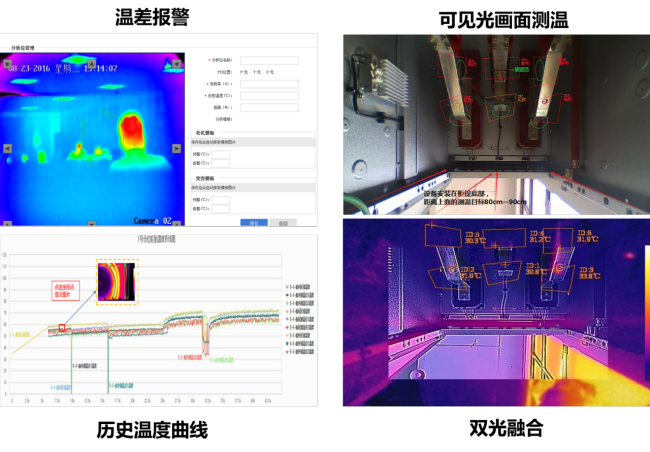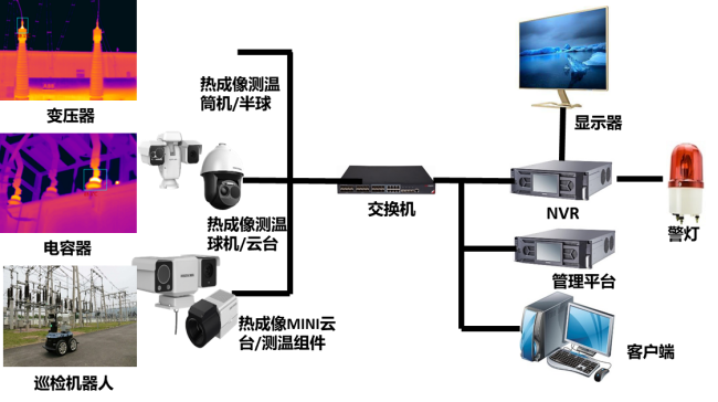 解決方案 熱成像測(cè)溫是通過非接觸方式檢測(cè)運(yùn)行中的設(shè)備溫度和運(yùn)行狀態(tài),可以簡(jiǎn)捷、安全、直觀、準(zhǔn)確的查找、判斷設(shè)備過熱故障,迅速采取措施解決防止電氣事故的發(fā)生。結(jié)合熱像儀在設(shè)備故障診斷中的一些實(shí)際應(yīng)用,熱成像測(cè)溫為設(shè)備精細(xì)化點(diǎn)檢和維修提供有力依據(jù),及時(shí)將設(shè)備事故消滅在萌芽狀態(tài),有效避免由于設(shè)備異常而導(dǎo)致的事故。本系統(tǒng)設(shè)計(jì)建設(shè)一套基于熱成像的整體解決方案,能夠幫助快速發(fā)現(xiàn)設(shè)備和線路的異常和缺陷。